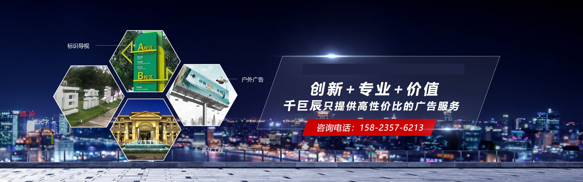 重慶千巨辰廣告有限公司是由重慶五樂廣告有限公司十余年發展后的專業廣告公司,切重慶樂千辰裝飾工程有限公司為下屬公司,具備一般納稅人資質。我司集廣告設計、加工制作、配送安裝為一體的廣告實業公司,廠房1200多平米,公司機構健全,擁有業務部、設計部、制作部、工程部,致力于發展戶外廣告、燈飾亮化、各類燈箱、標識標牌、發光字、燈箱廣告、亮化工程、廣告制作項目等,現擁有30多位員工,是一家頗有發展前景的廣告公司。